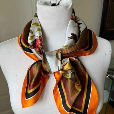 Nydelig silkeskjerf med med hvite blomster. Mykt og behagelig. 100%silke. Veldig fin silke i skjerfet, da det er er mulberry silke som er den beste silke kvaliteten. Enkelt å dandere på ulike måter da silken er så fin. Helt nytt. Størrelse 53x53cm. Kan gjerne sende med posten til 31.-