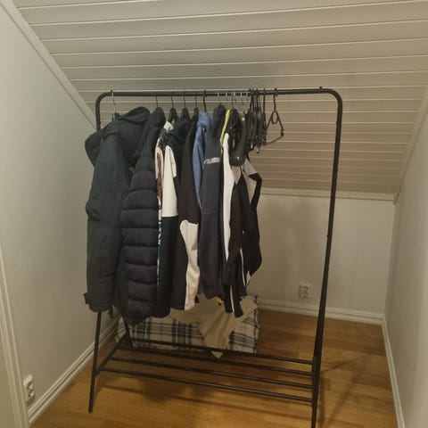 Liten klesstativ selges billig. Må hentes. https://www.clasohlson.com/no/Klesstativ-med-skohylle,-svart/p/44-3837