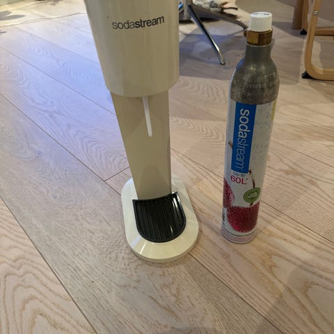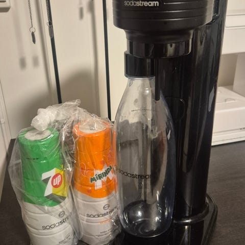 Sodastream kullsyremaskin i svart farge med tilhørende flaske.
