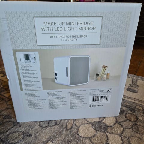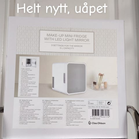 Fint brukt minikjøleskap med speil selges. Fint å bruke til sminkespeil siden det er mulig å skru på lys i speilet. Det er plass til å oppbevare sminke i kjøleskapet. Tar liten plass. Kjøpt på Clas Olsen. Selges på grunn av plassmangel.