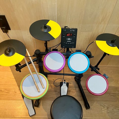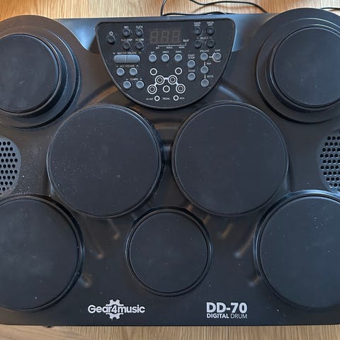 ELektronisk trommesett med flere trommepads, pedal og trommestol. Settet har svart farge og er egnet for øving og opptredener i hjemmet eller studio. Komplett med trommestikker og tilkoblingsmuligheter for lydutstyr.