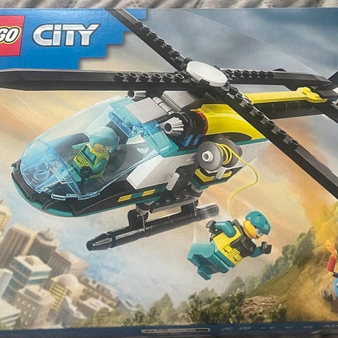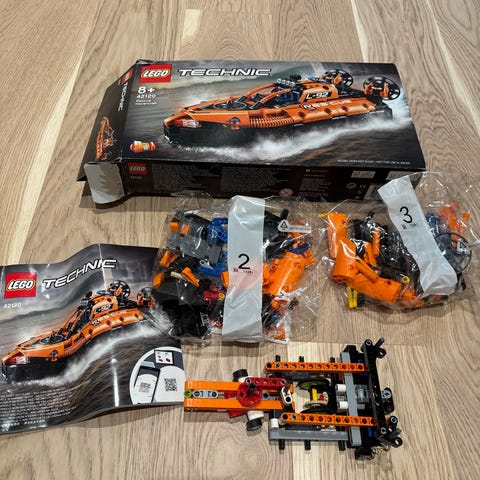 LEGO City Red Rescue Hovercraft lekesett med tilhørende instruksjonsbok uten original emballasje. Noen små detaljer kan være manglende. Settet inkluderer en rød og svart redningsfarkost. Passer for barn som liker by- og redningstema.