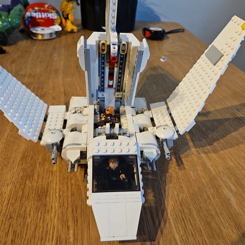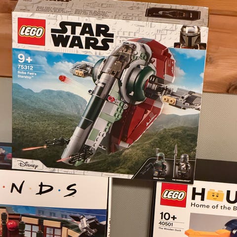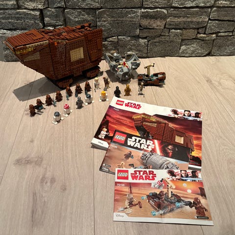 LEGO Star Wars Slave I 75243 og 75344 med alle minifigurer inkludert (ser at Han solo ikke ble med på første bildet men han er også inkludert, se siste bildet). Princess Leia jubileumsfigur er med. Settene er bygget en gang, stått på hylle og skal være komplette.