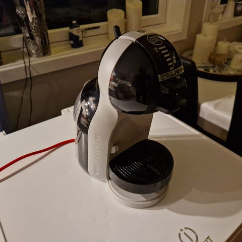 Nescafé Dolce Gusto kaffemaskin med kontrollpanel og knapp for brygging. Designet i hvitt og svart plastmateriale. Passer til bruk med Dolce Gusto kapsler for enkel tilberedning av kaffe og andre varme drikker.
