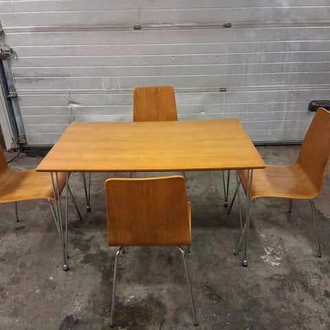 Ingeborg bord og Ingolf stoler selges samlet noe bruks merker . Bordet er 155 cm med illegsplate