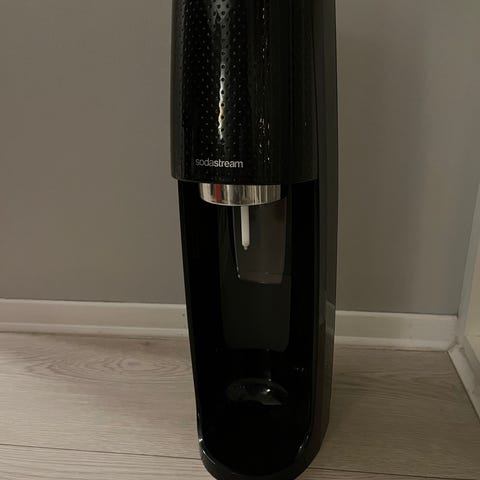 Sodastream Sodastream kullsyremaskin med tilhørende kullsyreflaske. Maskinen er hvit og har en enkel design for å tilsette kullsyre til vann hjemme.