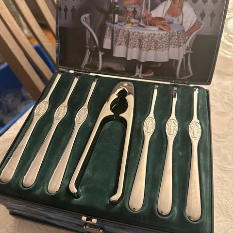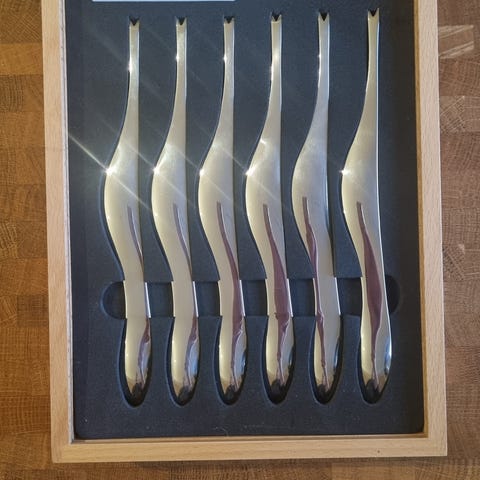 Har to gavesett med skalldyrgafler fra Hardangerbestikk i rustfritt 18/8 stål. NorCargo logo på innsiden av eskene. Aldri brukt. Selger begge for kr. 600,- + frakt evt. kr. 350,- pr stk.
