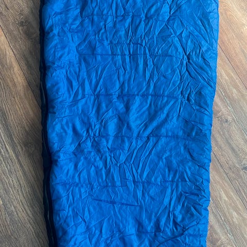 Fjellpulken sovepose i blå og rød farge. Soveposen er designet for utendørs bruk og har isolerende egenskaper for å holde brukeren varm i kalde forhold. Materialet og størrelsen er tilpasset for komfort og funksjonalitet.