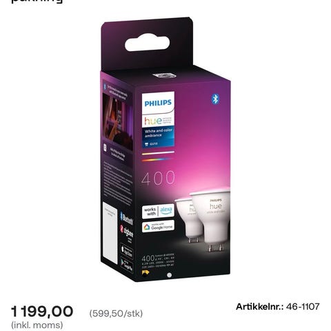 Philips Hue White and Color Ambiance LED-pærer med effekt på 9,5 watt. Pærene støtter RGBW-farger og kan styres via Bluetooth. Passer til standard sokkel og kan brukes til belysning med justerbar farge og lysstyrke.