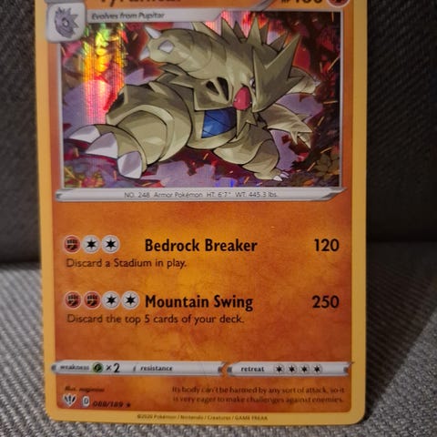 Jeg selger en Tyranitar fra Aquapolis for 450 kroner. Har prøvd å sette pris ut fra tilstand. Be gjerne om flere bilder. Jeg har også mye annet Pokemon til salgs, så ta gjerne en titt på mine andre annonser.