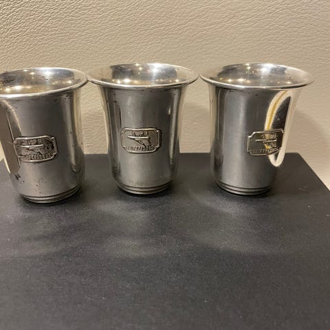 To stk. gamle pokaler. På den ene pokalen står det "damernes pr 1945" den er stemplet med tallet "65" på undersiden. Den andre pokalen står det ingenting på, det ser ut som sølvplett, men jeg vet ikke, jeg finner ikke noe stempel på den. Selges til høystbydende.