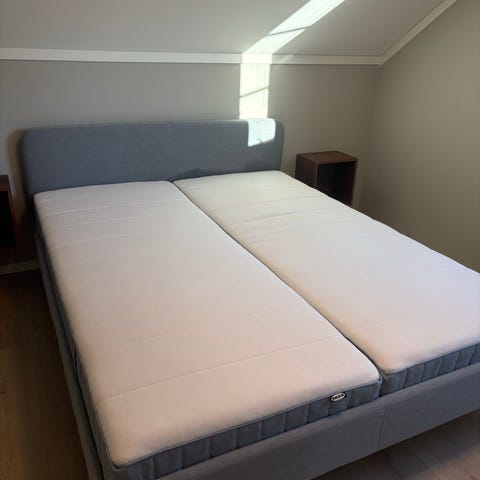 Seng fra IKEA kjøpt i 2017/2018 litt usikker på nøyaktig år. Selges grunnet byttet til ny større seng. Blitt pent brukt, ikke synlige skader på selve rammesengen. Et par flekker på ene overmadrassen. Beina er byttet ut til høyere enn det som fulgte med slik at det er mulighet for lagring under sengen.