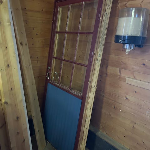 Venstre gangdør. (Slår ut) 198*138. God stand. Stått beskyttet. Isolerglass. 80-90 tallet? Kr 2.500,-. Drivhus, lysthus,naust, hagestue, levegger.