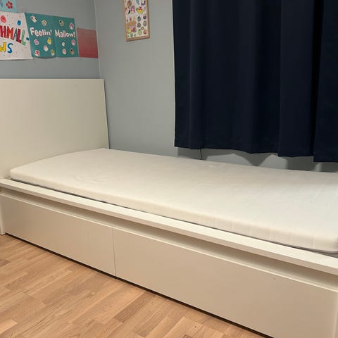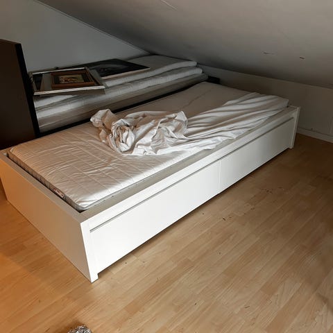 God enkeltseng med masse lagringsplass. To store og to små skuffer. Senga er veldig lik Hemnes dagseng, men den kan ikke trekkes ut. Det er skåret hull til stikkontakt i den ene kortsiden (se bilde). Ellers noen bruksmerker. Senga er demontert og klar til henting.