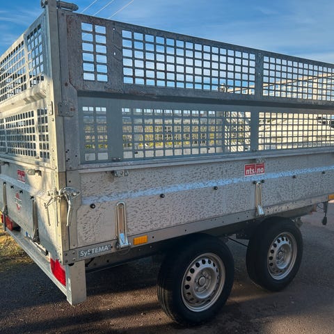 Alle lemmer han tas ned og av, hjørnestolper han tas av og det er integrerte fester til pressening i hengsler. Stroppefester foran og bak i kasse likt som på siden.