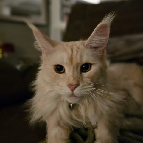 Vi har en nydelig svart smoke Maine Coon jente på 13 mnd som leter etter sitt for alltid hjem. Hun er veldig intelligent, har gode instinkter, er veldig nyskjerrig og kjærlig med nydelige trekk. Stor hale og store øretufser. Hun kan apport (henter leker i munnen når du kaster dem og tar den med tilbake til deg), leker med vann og snakker masse. Selvstendig og bestemt. Veldig herlig jente, som er høyt elsket.