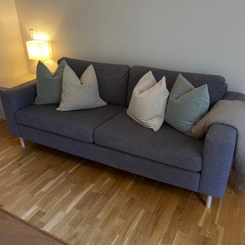 Flott sofa fra Bolia. Putene er av kaldskum og er svært holdbare, de oppleves ikke nedsittet eller slitt. Trekket er Baize grey, litt slitasje på noen putetrekkene. Trekket kan taes av og vaskes på 30 grader.