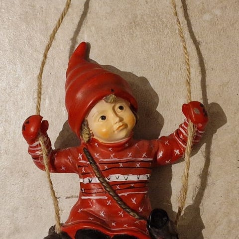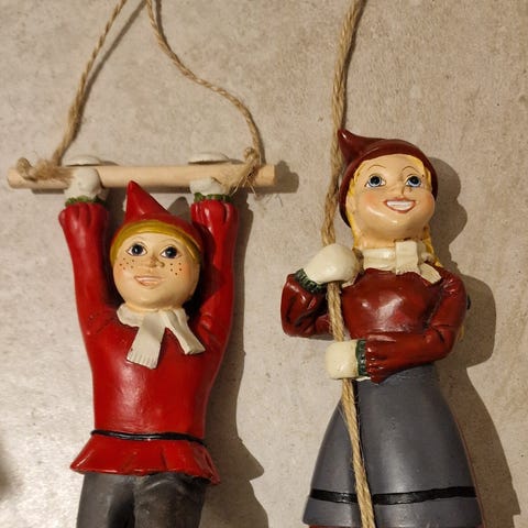 To nissefigurer i dekorativt design, en gutt og en jente, kledd i tradisjonelle klær med røde, grønne og brune farger. Begge står på en snødekt base med tilbehør som sekker og lys. Egnet som juledekorasjon.