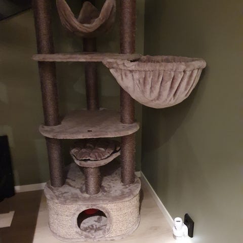 Så etter at jeg hadde kjøpt stativet at den var beregnet for katteunger blei dessverre for liten for mine to store hannkatter. Den er ikke brukt, kun skrudd sammen. Står bare til pynt inne i boden, vil gjerne at noen andre katter skal få glede av den.