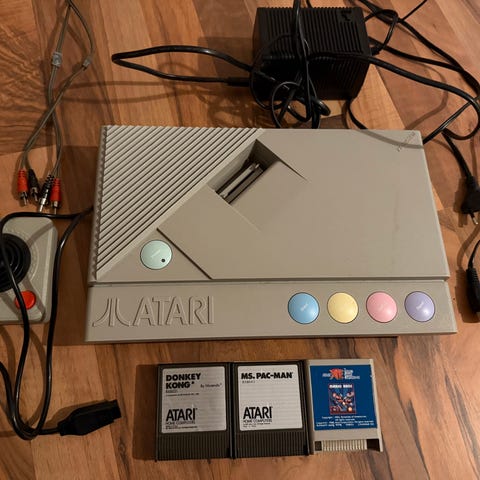 Ikke testet siden barndommen men fungerte da det ble lagt bort. Gummi mangler på joystick. 8 spill følger med.