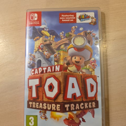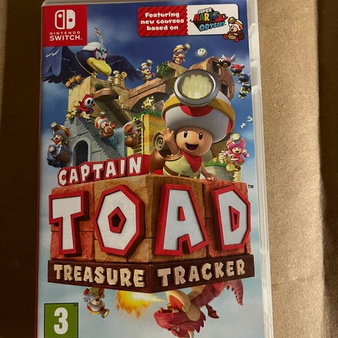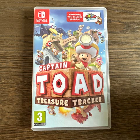 Nintendo Switch Captain Toad Treasure Tracker spill. Plattformspill med pusleelementer hvor spilleren styrer Captain Toad gjennom ulike nivåer for å samle skatter.