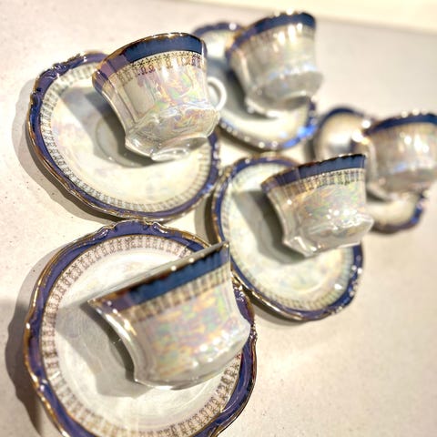 Eggeglass, kopp og asjett.