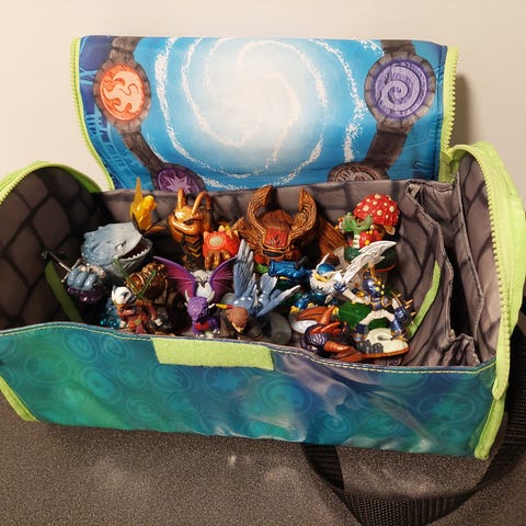 Skylanders oppbevaringsboks med flere tilhørende figurer. Boksen er rund med lokk, og har motiv fra Skylanders-serien. Egnet for oppbevaring og organisering av Skylanders-leker og figurer.