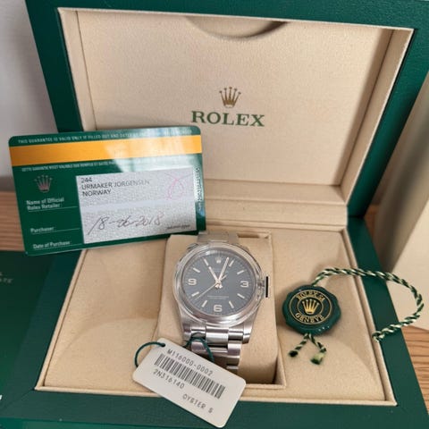 Rolex Explorer 36 124270 fra oktober 2021, fortsatt 10 måneder igjen av garanti. Klokken er godt brukt og har litt riper/hairlines, men ingen dype hakk som ikke kan poleres bort. Den går fint, og trekker godt.