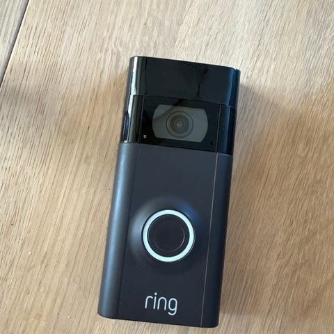 Ring Video Doorbell med kamera og tilbehør inkludert. Enheten er laget for å overvåke inngangspartiet med video og lyd. Leveres med strømforsyning og monteringsutstyr.