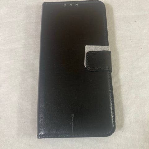Apple telefondeksel i svart med innebygde kortlommer. Dekselet har en klaff med knapp for lukking og er laget for å beskytte telefonen samtidig som det gir plass til oppbevaring av kort. Materialet på utsiden er imitert skinn, og innsiden har et mønster for bedre støtdemping.