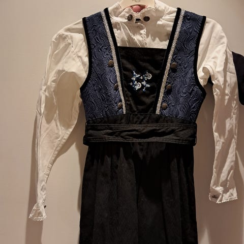 Flott blå svart festdrakt med hvitt skorte. Glidelås på ryggen, belte rundt livet. Hel, ingen bruksmerker. Brukt kun i to anledninger av et barn. Røykfritt og dyrefritt hjem.