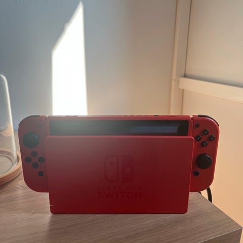 Nintendo switch selges brukt; det følger med Super Mario Bros. U Deluxe (eller såillet kan selges alene for 450kr). Tilbehør for kobling til tv samt strømkabel følger med. Kontrollertilbehør som vises i bilde.