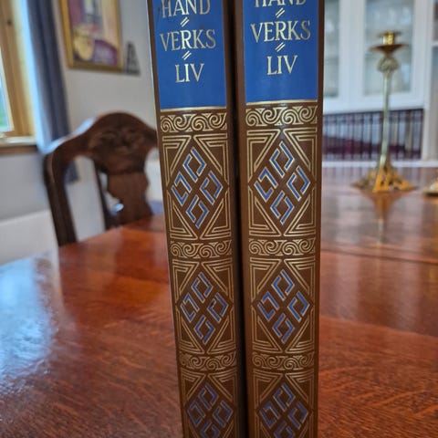 Håndverksliv i 2 bind, praktutgivelder med skinnrygg og dekorative mønstre på omslaget. I fin stand.