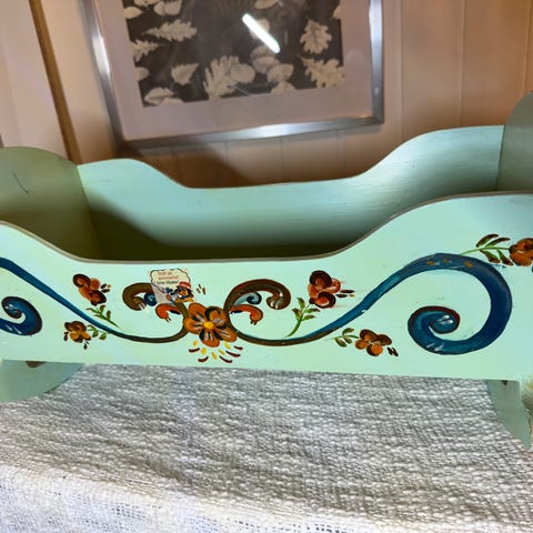 Sjarmerende håndmalt dukkevugge i tre – nostalgisk stil