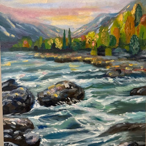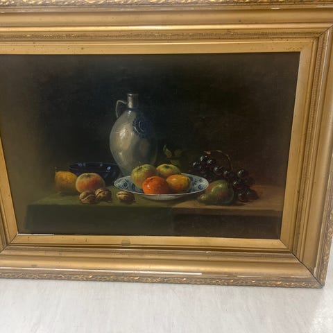 Innrammet landskaps maleri av ukjent kunstner. Landskap med fjord og fjell i bakgrunnen, med gård og åker, og dampbåt som kommer forbi.