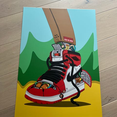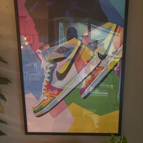 Med motiv av røde og hvite sneakers, i fargerik bakgrunn. Plakaten er innrammet med en gyllen ramme.
