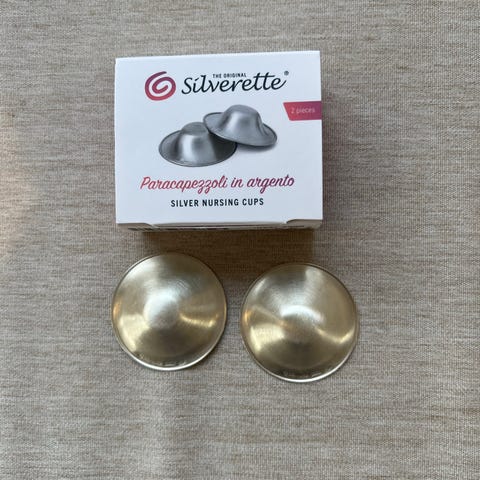 Kit med brystknoppbeskyttere og silikonring i størrelse regular. Den ene har en klemskade (se bilde), men det påvirker ikke bruken.
