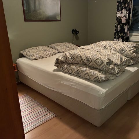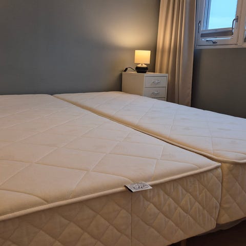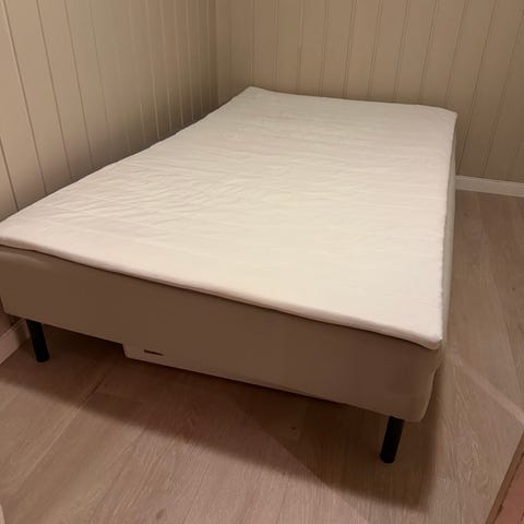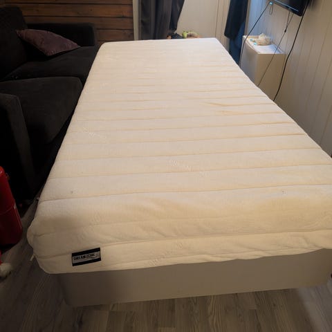 120 seng selges uten overmadrass. Kjøpt på Jysk for 4 år siden. Det er en knekt planke under, men fullt brukbar og deilig å ligge i.