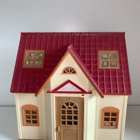 Sylvanian Families dukkehus med flere rom og et rødt tak. Laget i plast materiale, designet for lek og oppbevaring av små dukker og tilbehør. Trengs en vask.