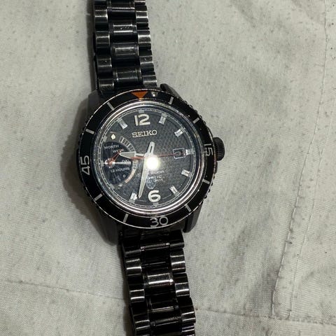 Seiko herreklokke med blå urskive, stållenke og automatisk urverk. Klokken har tydelige markører og dag/dato indikator, egnet for daglig bruk. 43mm urkasse og 22mm bred lenke. Kvittering, lenke ledd og klokkeboks følger med.