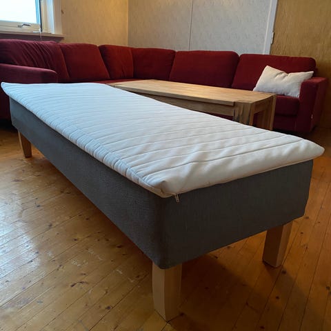 Kan selges med en lite og pent brukt, fast og veldig god madrass (90*200) fra Møbelringen. Madrassen har vært brukt til en gjesteseng, med overmadrass over. Nypris: 6000kr. Selges for 2500kr. Samlet pris, seng og madrass: 3000kr