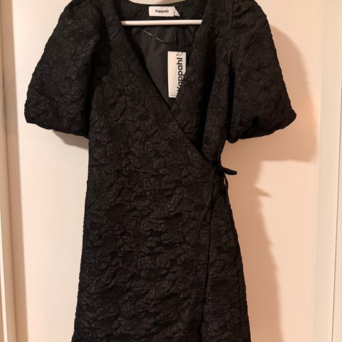KappAhl festkjole i størrelse 164 laget av svart fløyel. Kjolen har puffede ermer i gjennomsiktig materiale og er designet for kvinner.