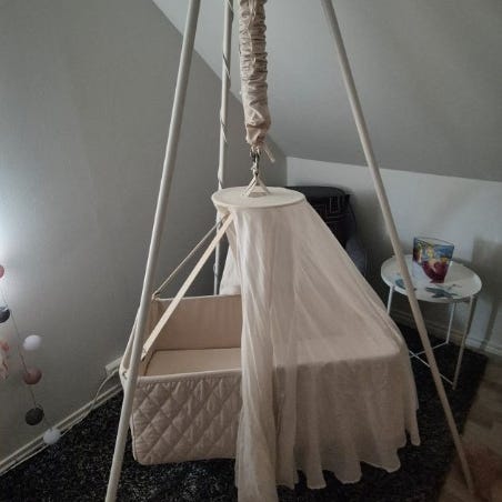 Pent brukt Moonboon med flatbunn. Kjøpt ny av oss og kun brukt til ett barn i 5 mnd. Har brukt aerosleep overmadrass som beskyttelse. Følger med mørkegrått stativ, orginal motor, vugge og sengehimmel.