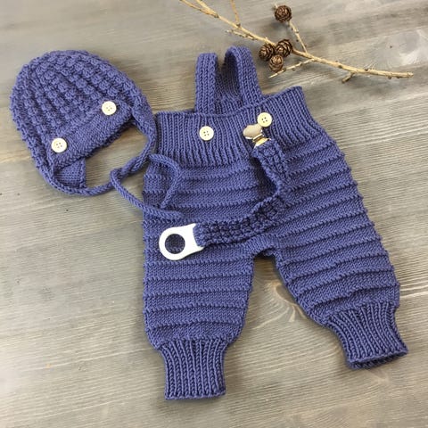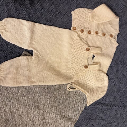 HENTESETT til baby gutt, 0-3 mndr. Lys blå og hvitt. Jakke, bukse, lue, sokker og votter. 925 kr. Strikket Drops Baby Merino, 100 % ull. Pent arbeid. Buksen er strikket høyere bak. Ingen knuter eller sømmer, bortsett fra litt bak på sokkene. Masket sammen under armene og i skrittet