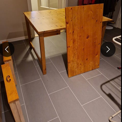 Bordet er i relativt god stand (noe riper og slitasje) mens stole er mer slitt.