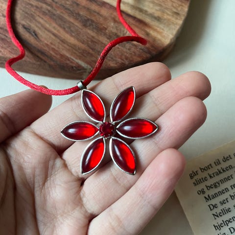Elegant vintage halskjede med sort snor og dekorativt roseanheng i mørk burgunder/svart med små steiner. Justerbar lengde. Veldig fint som statement-smykke 🌹 Se bilder for mål.