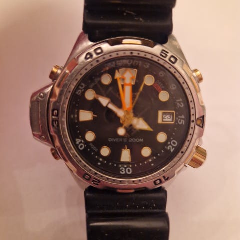 Denne er brukt, men ikke av meg. Ser ut til å fungere som den skal. Den har noe bruksmerker men alt i alt en pen klokke.
