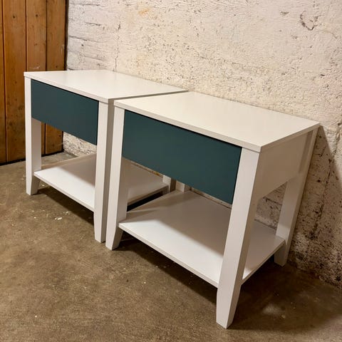 Selger 2 st vegghengte nattbord i messingfarget metall med to hyller av glass fra Ellos Home. Pent brukt. Må hentes.