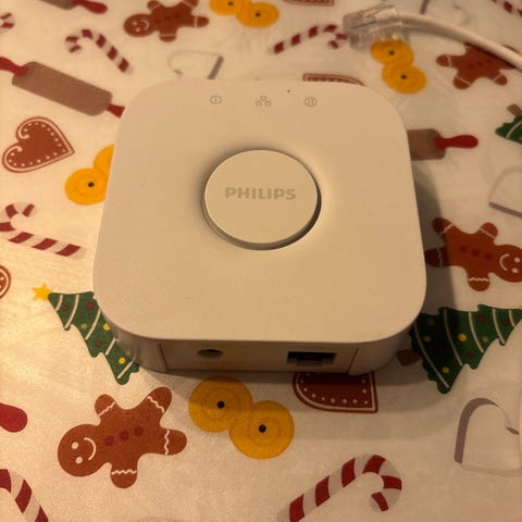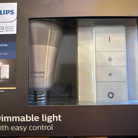 Philips Hue Dimmer Switch for trådløs lyskontroll. Produktet inkluderer en veggmontert bryter og en fjernkontroll, kompatibel med Philips Hue smart belysningssystem. Designet for enkel installasjon og bruk.