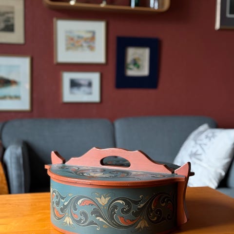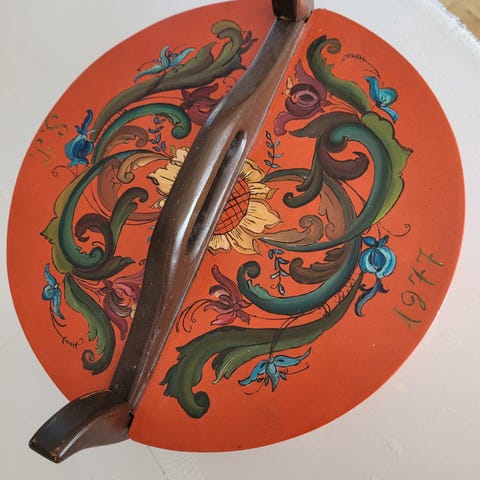 Rosemalt kaketine med initialer LMN og 1983